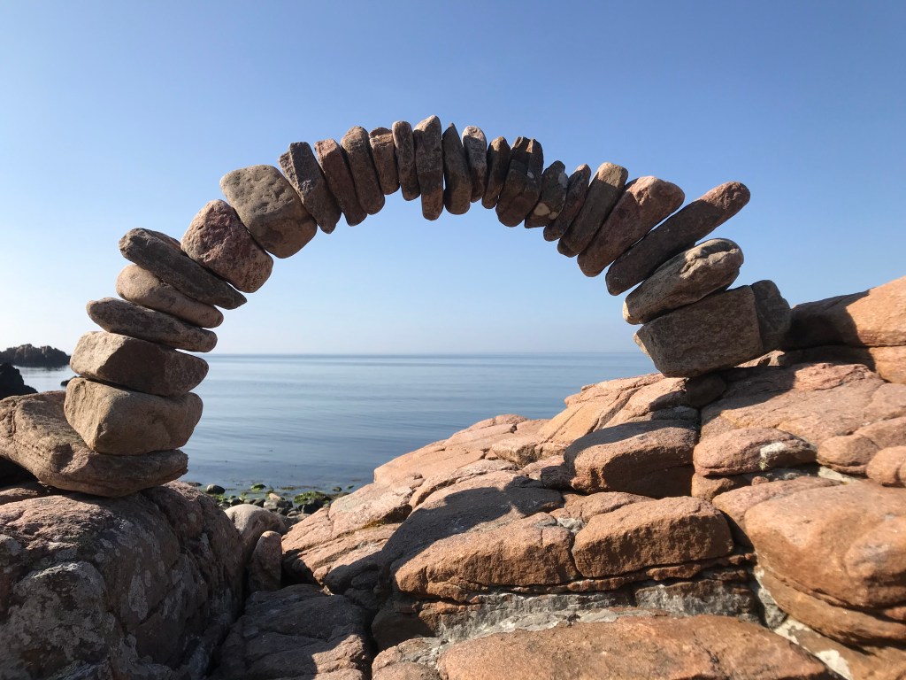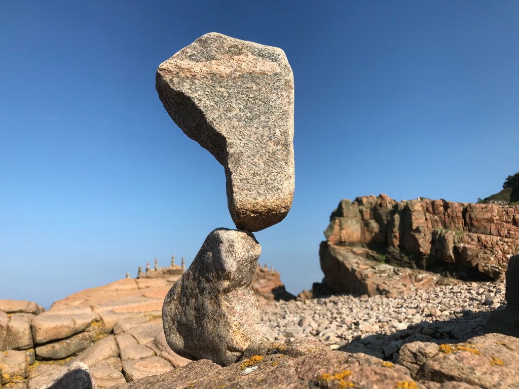In Hovs Hallar, einem nationalen Schutzgebiet an der Küste von Schweden, entdecke ich erstaunliche Kunstwerke aus Stein. Eines davon umrunde ich, weil ich kaum glauben kann, dass es von alleine in dieser Position stehen kann. Der obere Stein, der auf dem unteren balanciert, hat eine Höhe von etwa 1,5 m. Er steht komplett ohne irgend eine künstliche Sicherung auf dem unteren. Hier war ein grossartiger Künstler am Werk!