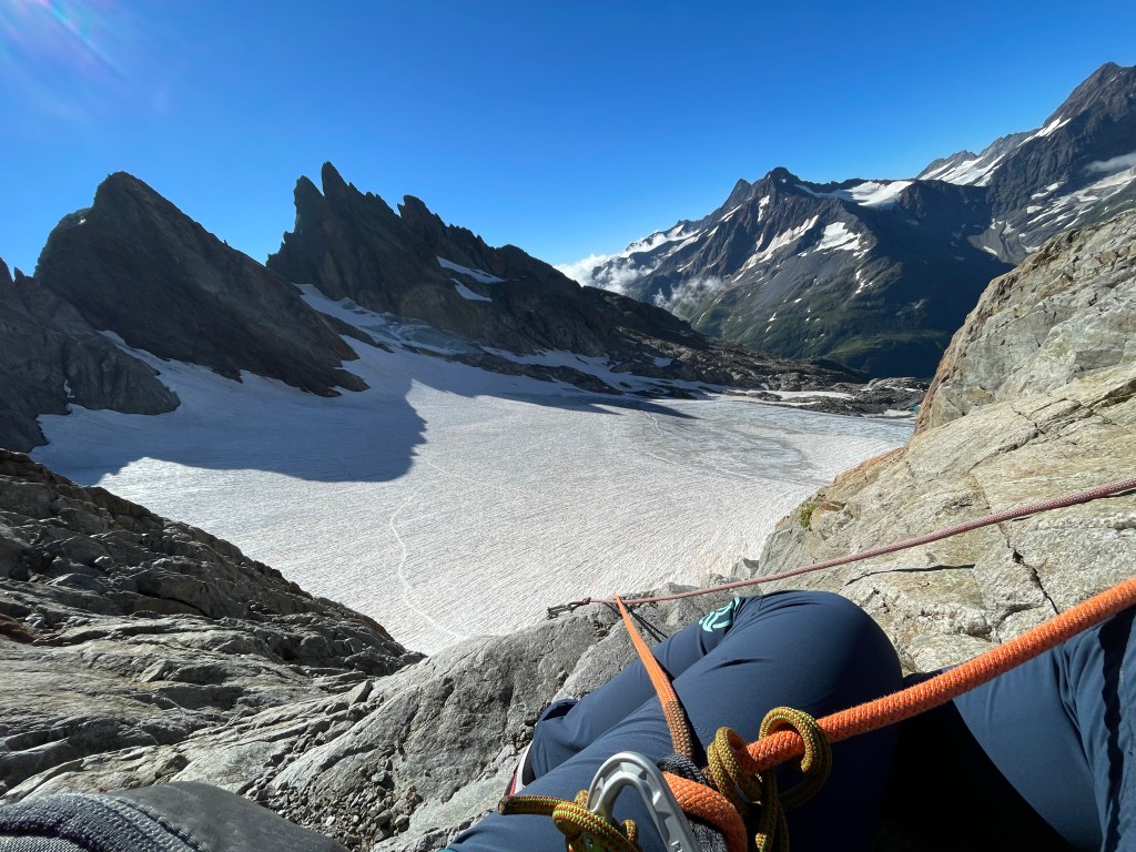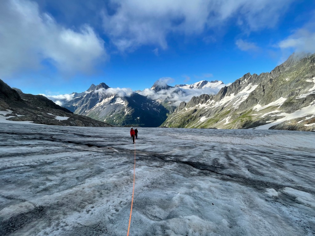 Bruno übernimmt die Führung der Seilschaft, Hansueli die Sicherung am Ende. Mit uns Dreien in der Mitte. Hier, mitten auf dem Gletscher zu stehen, ist faszinierend. Er ist verletzlich, der Gletscher. Welche Tragweite das hat, erfahren wir zwar aus den Medien. Immer und immer wieder.