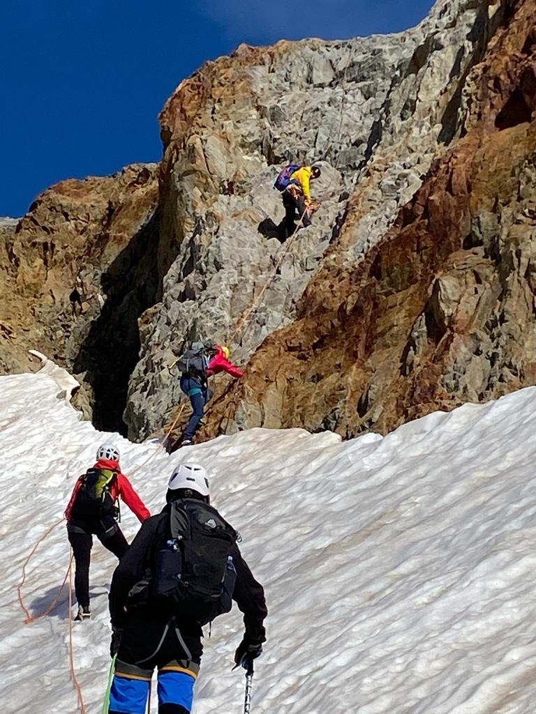 Bis hierhin waren wir auf steinigem Untergrund unterwegs. Ab jetzt wird’s eisig. Wir montieren die Steigeisen. Die Überquerung des Grassen-Gletscher liegt vor uns.
