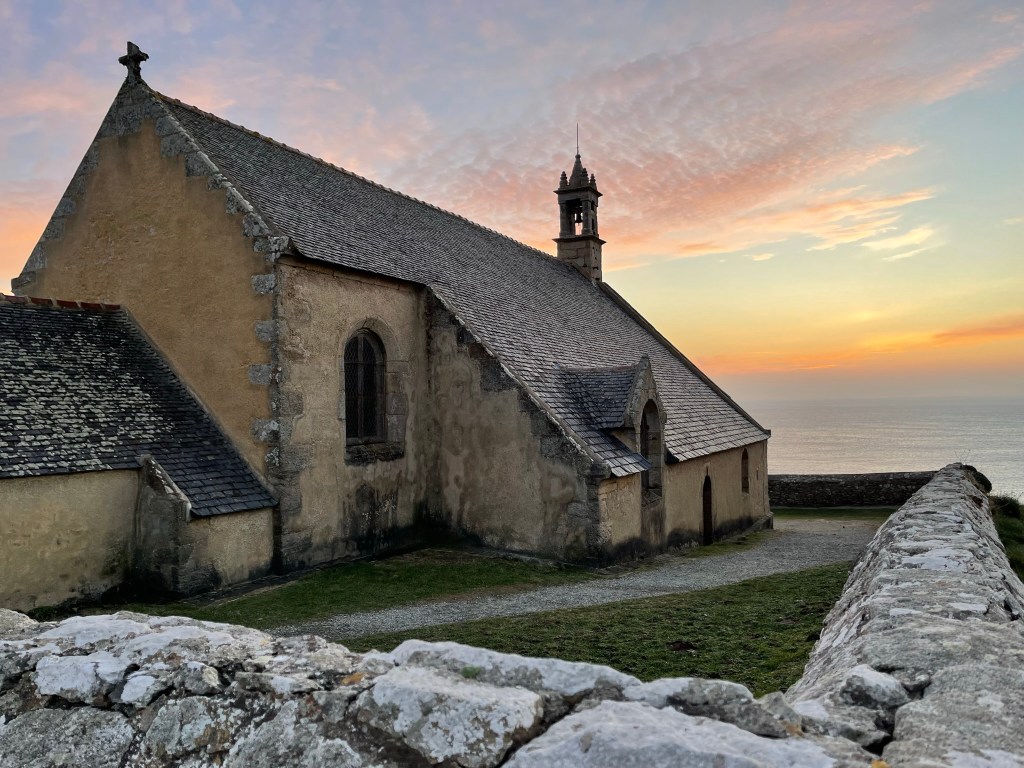 Der Abendspaziergang mit den Hunden, hoch über dem Nordatlantik auf einer Landzunge zum Point du Van , führt uns zu einer kleinen, alten im 17. Jahrhundert erbauten Kirche.