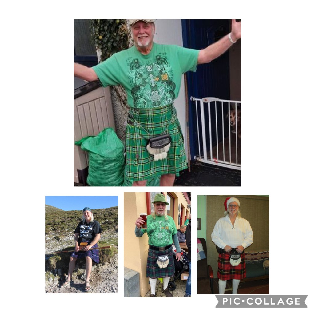 Ich trete näher und werfe einen Blick durchs offene Fenster. Tatsächlich! Ein grün-blau karierter Kilt, hohe weisse Socken und dazwischen behaarte Männerbeine. Ich muss schmunzeln. „Wow! Das sieht cool aus! Du bist der erste Ire in einem Kilt dem ich begegne. Danke dafür!“ Er ist sichtlich stolz.