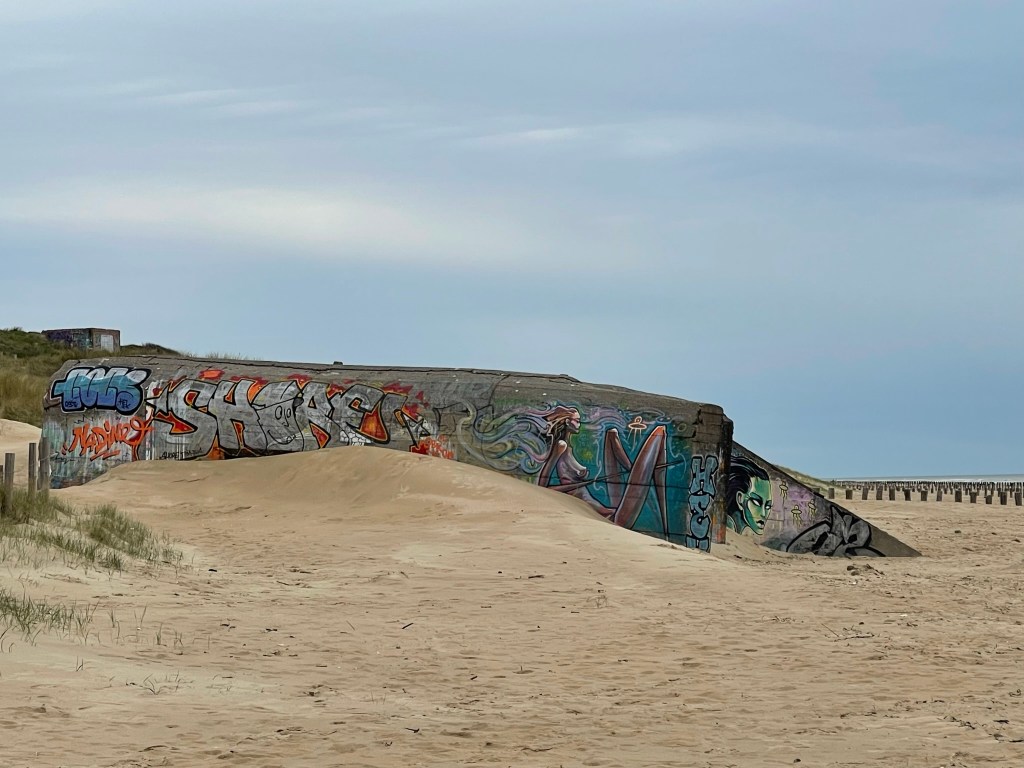 Auf unserem Strandspaziergang fallen uns einmal mehr die vielen Bunker auf. Sie sind überall entlang der Küste zu finden. In der Normandie, in Haut Frankreich bis in die Bretagne sind wir ihnen begegnet.